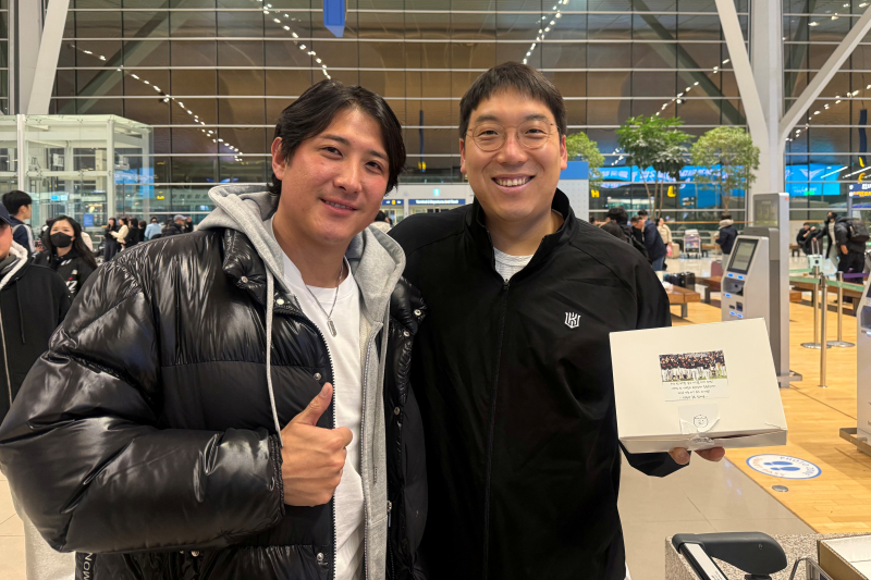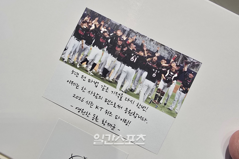 21일 호주 스프링캠프를 떠나는 KT 선수들을 위해 황재균이 마련한 간식 박스. 인천공항=윤승재 기자 KT 선수단이 스프링캠프를 위해 호주로 출국하던 지난달 21일 새벽 5시, 인천국제공항에 깜짝 등장했다. 호주로 떠나는 선수단을 응원하기 위해서였다. 빈손으로 오지 않고 샌드위치와 쿠키 세트를 챙겨와 선수들에게 나눠줬다. 황재균이 전달한 간식 박스엔 "5년 전 마법 같은 기적을 다시 한번! 이제는 한 사람의 팬으로서 응원합니다. 2026시즌 KT 위즈 파이팅!"이라는 문구를 넣었다. 비록 은퇴는 했지만 선수단과 마음을 함께한다는 의미였다.