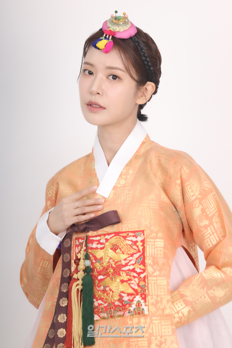 배우 정유진이 서울 순화동 KG타워에서 진행된 일간스포츠 설맞이 인터뷰에 앞서 곱게 차려 입은 한복 차림으로 포즈를 취하고 있다.정유진은 주황색 당의와 은은한 금장 문양이 어우러진 한복으로 단아하면서도 위엄 있는 분위기를 연출했다.