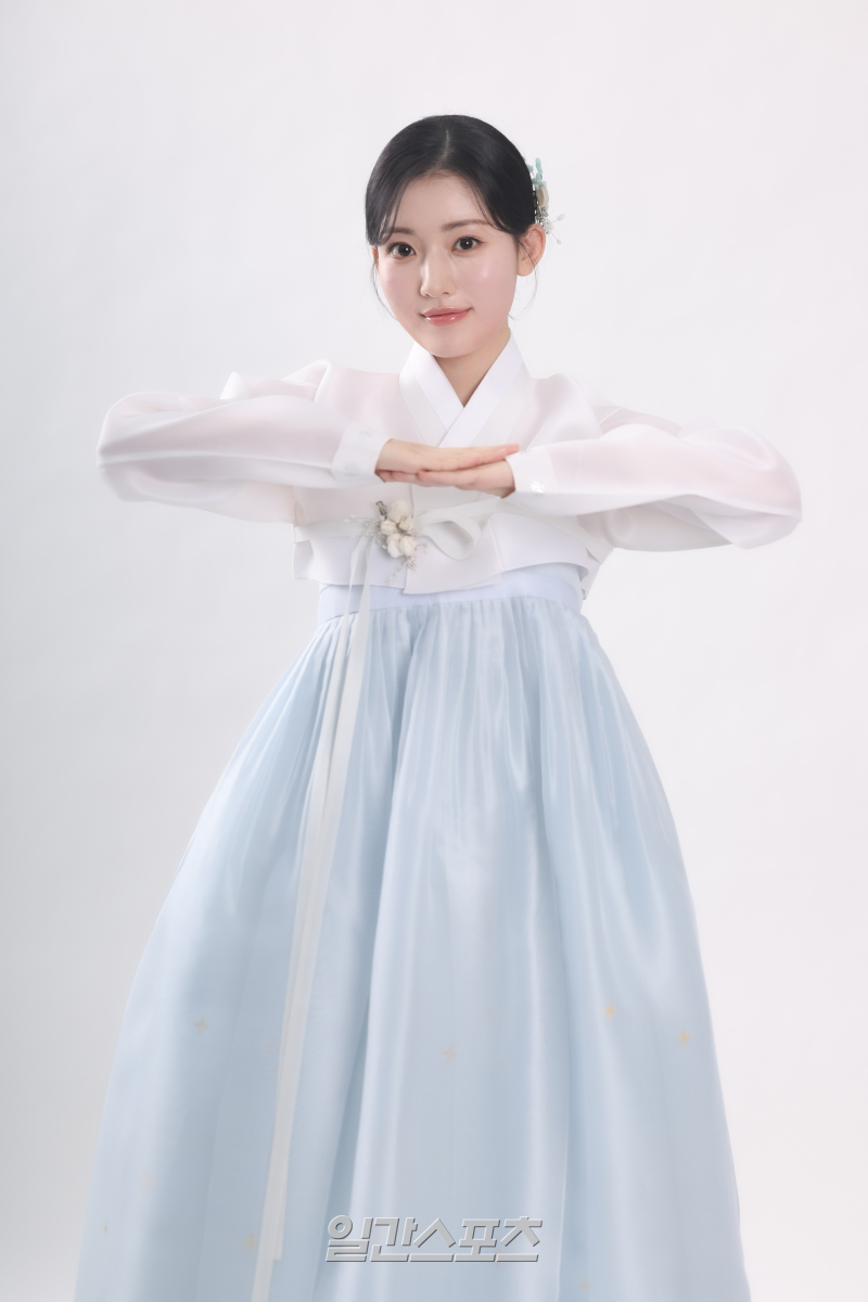 배우 정다빈이 서울 순화동 KG타워에서 진행된 일간스포츠 설맞이 인터뷰에 앞서 곱게 차려 입은 한복 차림으로 포즈를 취하고 있다.정다빈은 파스텔톤 하늘색 치마에 로우번 헤어를 더해, 선녀 같은 분위기의 단아한 한복 자태를 완성했다.