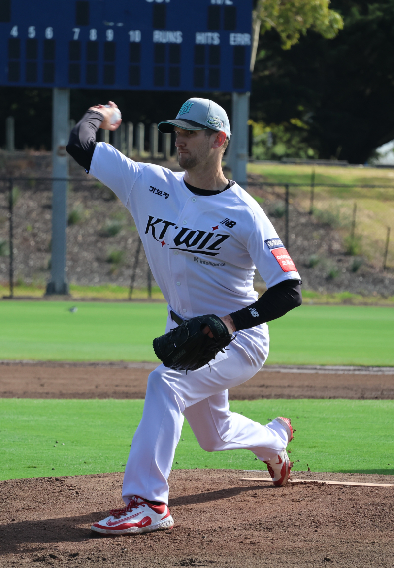 국제무대에서 생소한 언더핸드 스로인 고영표는 "첫 라이브 피칭에서 아쉬운 부분을 개선하려고 노력했다. 감독, 코치님들 덕분에 만족스러운 변화가 있었다"며 "제구와 힘 전달이 잘 되고 있다. 준비가 잘 됐다. 국제대회에서 책임감과 사명감을 갖고 잘 던질 수 있도록 하겠다"고 다짐했다. 소형준. 구단 제공 오른손 투수 소형준도 마찬가지로 40개의 공을 던졌고, 직구 최고 구속은 143㎞가 나왔다. 소형준은 "컨디션과 구속 모두 점점 좋아지고 있고 있다. 대회에 맞춰 컨디션을 잘 준비하겠다"며 "이번에는 꼭 대표팀으로서 팬들께서 만족하실만한 모습을 보여드리고 싶다"고 각오를 다졌다. 박영현. 구단 제공 구원 투수 박영현은 직구 최고 시속 143㎞를 기록했다. 제춘모 코치는 "2022시즌 투산 스프링캠프 때 정말 좋은 공을 던졌는데, 오늘 그 모습이 나왔다. 트랙맨 데이터상 직구 효율성이 100%로 기록됐다. 특히 수직 무브먼트가 좋았다"고 흡족해했다. 박영현은 "힘을 실어 던졌다. 지난 라이브보다 훨씬 느낌이 좋다"며 "좋은 감각을 WBC에서도 이어갈 수 있게 준비를 잘하겠다"고 밝혔다. 보쉴리. 구단 제공 한편, 새 외국인 투수 케일럽 보쉴리는 포심 패스트볼 평균 146㎞, 최고 148㎞를 기록했다. 제 코치는 "타자를 상대로 구위를 점검하기 위해 80% 정도로 몸을 끌어올린 채로 투구했다. 커맨드가 좋아 원하는 곳에 정확하게 투구할 수 있는 영리한 투수"라고 기대했다. 보쉴리는 "가볍고 부드럽게 던지려고 했는데, 원하는만큼 힘이 잘 사용해 던졌다. KBO 타자들을 상대로 아웃 카운트를 늘리는 게 어렵다고 알고 있다. 야수들의 수비를 믿고 공격적으로 투구하며 KBO 타자를 상대하고 싶다"고 각오를 밝혔다.