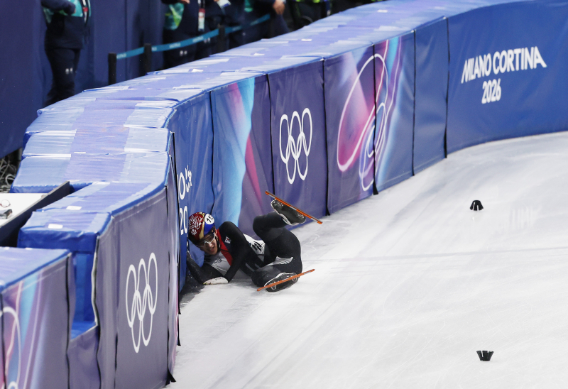 14일(현지시간) 이탈리아 밀라노 아이스스케이팅 아레나에서 열린 2026 밀라노-코르티나담페초 동계올림픽 쇼트트랙 남자 1500m 준준결승에서 임종언(113)이 넘어지고 있다. [사진=연합뉴스]