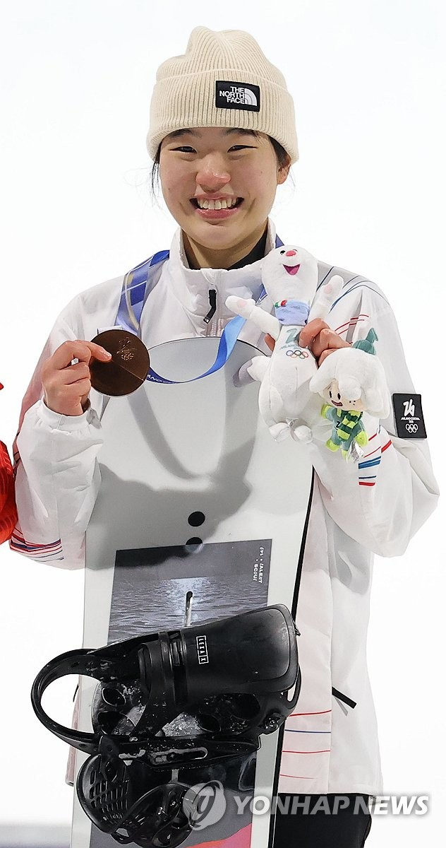유승은 스노보드 빅에어 동메달_(리비뇨=연합뉴스) 류영석 기자 = 9일(현지시간) 이탈리아 리비뇨 스노파크에서 열린 2026 밀라노-코르티나담페초 동계올림픽 스노보드 여자 빅에어 시상식에서 동메달을 차지한 유승은이 기념촬영을 하고 있다. 2026.2.10 ondol@yna.co.kr