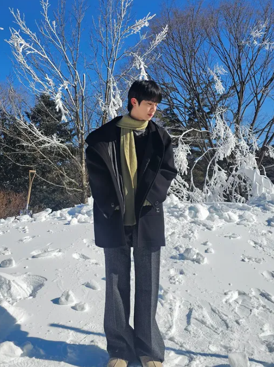 사진에서 진은 푸른 하늘과 하얗게 눈이 쌓인 나무를 배경으로 서 있다. 진은 검은색 코트에 회색 계열 슬랙스로 깔끔한 패션을 선보였고, 여기에 올리브 색깔 머플러로 포인트를 더했다.