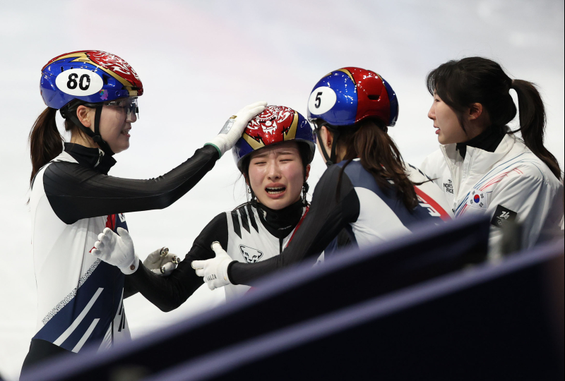 18일(현지시간) 이탈리아 밀라노 아이스스케이팅 아레나에서 열린 2026 밀라노-코르티나담페초 동계올림픽 쇼트트랙 여자 3000m 계주에서 금메달을 따낸 한국대표팀 김길리(가운데)가 눈물을 흘리고 있다. 왼쪽은 노도희, 오른쪽은 최민정. [사진=연합뉴스]