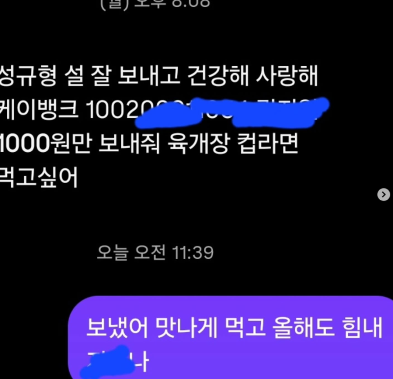 사진에는 장성규가 한 팬과 나눈 DM 메시지가 담겼다. 팬은 “성규 형 설 잘 보내고 건강해 사랑해”고 말한 후 자신의 계좌번호를 남겼다. 그러면서 “1000원만 보내줘. 육개장 컵라면 먹고 싶어”라고 덧붙였다.