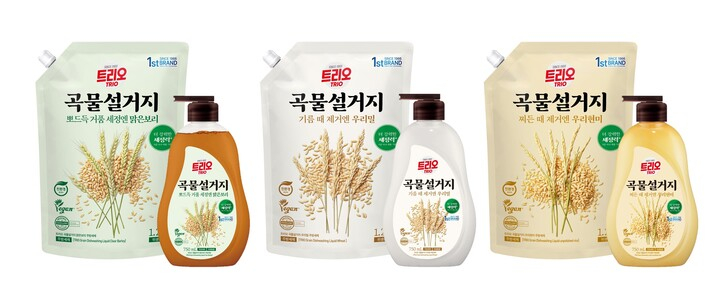 트리오 곡물설거지 주방세제는 △국내산 보리 성분을 함유해 식기 오염제거는 물론 풍성한 거품 세정을 도와주는 ‘곡물설거지 맑은보리’ △국내산 밀 성분을 함유해 기름때 세척에 효과적인 ‘곡물설거지 우리밀’ △국내산 현미 성분이 더해져 찌든 때와 냄새 제거에 탁월한 ‘곡물설거지 우리현미’ 등 총 3종으로 구성됐다.