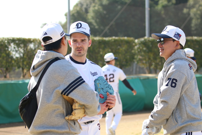 23일 미야자키 캠프 합류 후 캐치볼을 하는 잭 로그. 두산 제공 잭 로그는 아내의 출산 때문에 1월 말부터 호주 시드니 블랙타운에서 치러진 1차 캠프에 합류하지 못했다. 대신 개인 훈련을 하며 아내를 돌봤고, 2차 캠프 시작과 함께 두산 유니폼을 다시 입었다.