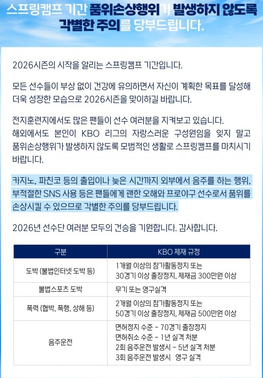 이번엔 달랐다. KBO는 "경찰 수사가 진행 중이지만, 선수들이 일으킨 사회적 물의와 그로 인해 실추된 리그 이미지 등 사안의 심각성을 고려해 선제적인 제재를 결정했다"고 밝혔다. 그만큼 이번 사안을 무겁게 받아들이고 있다.