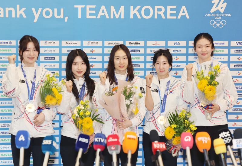 3,000m 계주 금메달, 쇼트트랙 여자대표팀 금의환향 (영종도=연합뉴스) 임화영 기자 = 2026 밀라노-코르티나담페초 동계올림픽 쇼트트랙 여자 3,000m 계주 금메달리스트인 노도희(왼쪽부터), 김길리, 최민정, 이소연, 심석희가 24일 인천국제공항 제2여객터미널에서 귀국 뒤 인터뷰를 하며 포즈를 취하고 있다. 2026.2.24 hwayoung7@yna.co.kr/2026-02-24 18:10:18/ <저작권자 ⓒ 1980~2026 ㈜연합뉴스. 무단 전재 재배포 금지, AI 학습 및 활용 금지>