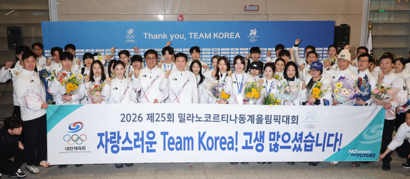 귀국한 밀라노-코르티나 동계올림픽 대한민국 선수단 (영종도=연합뉴스) 임화영 기자 = 최휘영 문화체육관광부 장관과 유승민 대한체육회 회장, 이수경 선수단장 등이 2026 밀라노-코르티나담페초 동계올림픽을 마치고 24일 귀국한 대한민국 선수단과 함께 인천국제공항 제2여객터미널에서 기념 촬영하고 있다. 2026.2.24 hwayoung7@yna.co.kr/2026-02-24 17:58:04/ <저작권자 ⓒ 1980~2026 ㈜연합뉴스. 무단 전재 재배포 금지, AI 학습 및 활용 금지>
