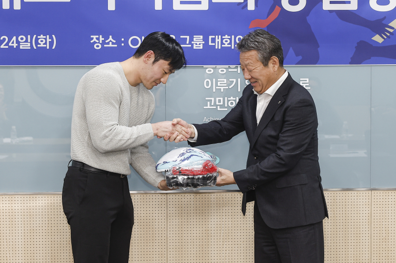 24일 서울 상공회의소에서 열린 사단법인 대한태그럭비협회 창립총회. 최윤 대한태그럭비협회 상임고문(오른쪽)이 협회 '1호 강사' 이준우에게 기념품을 전달하고 있다. 사진=대한태그럭비협회 제공