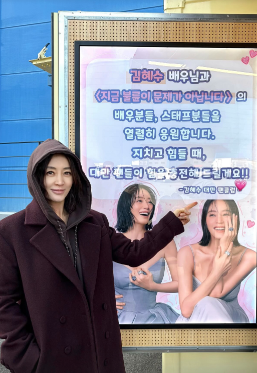 사진 속엔 김혜수가 출연하는 쿠팡플레이 새 시리즈 ‘지금 불륜이 문제가 아닙니다’ 촬영장에 도착한 커피차 선물 사진들이 담겨있다. 이번 선물은 멀리 대만 팬들이 준비한 것으로, 김혜수를 향한 국경 없는 팬심을 짐작게 한다.