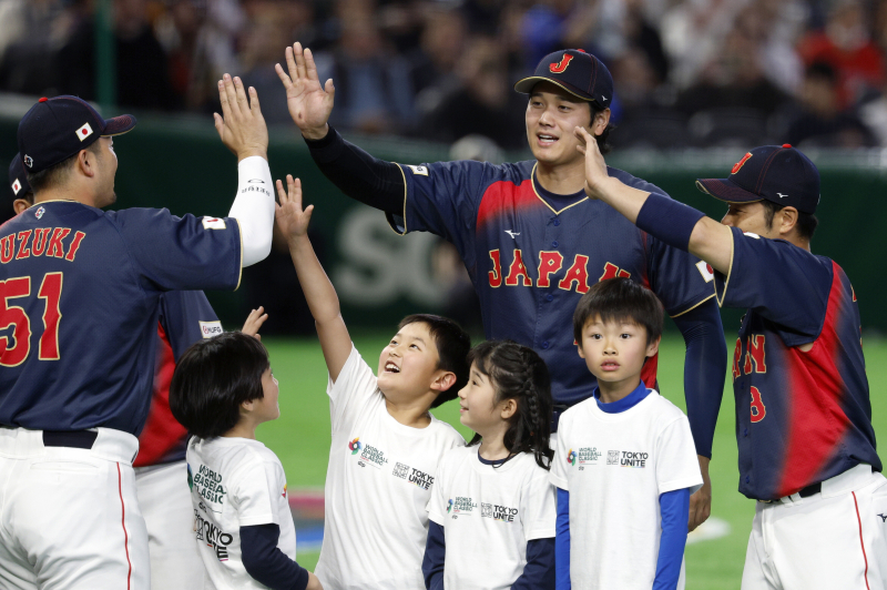 epa12798720 Japan?s Shohei Ohtani (C) greet high fives teammates before the World Baseball Classic (WBC) Pool C game between Japan and Taiwan at the Tokyo Dome in Tokyo, Japan, 06 March 2026. EPA/FRANCK ROBICHON/2026-03-06 19:36:31/ <저작권자 ⓒ 1980~2026 ㈜연합뉴스. 무단 전재 재배포 금지, AI 학습 및 활용 금지>