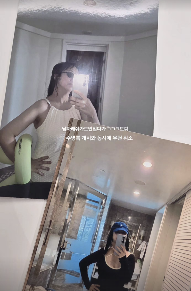 또 다른 사진에서는 블랙 수영복에 모자를 착용한 채 거울 앞에서 포즈를 취하며 날씬해진 몸매를 자랑했다.