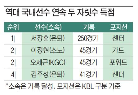 이정현은 지난 28일 열린 2025~26 프로농구 정규리그 원주 DB와의 홈 경기에서 팀 패배 속에서도 23점을 올리며 활약했다. 이로써 지난해 10월 8일부터 이어온 연속 두 자릿수 득점 기록을 45경기까지 늘려 오세근(현 서울 SK)과 함께 국내 선수 부문 역대 공동 2위에 이름을 올렸다.