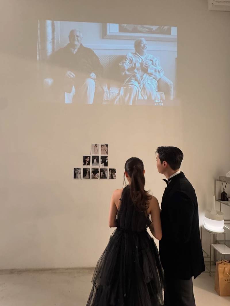 공개된 사진에는 드레스를 입은 박은영 셰프의 모습과 함께 예비 신랑의 뒷모습이 담겼다. 두 사람은 나란히 서서 영상을 바라보는 모습으로 훈훈한 분위기를 자아냈다.